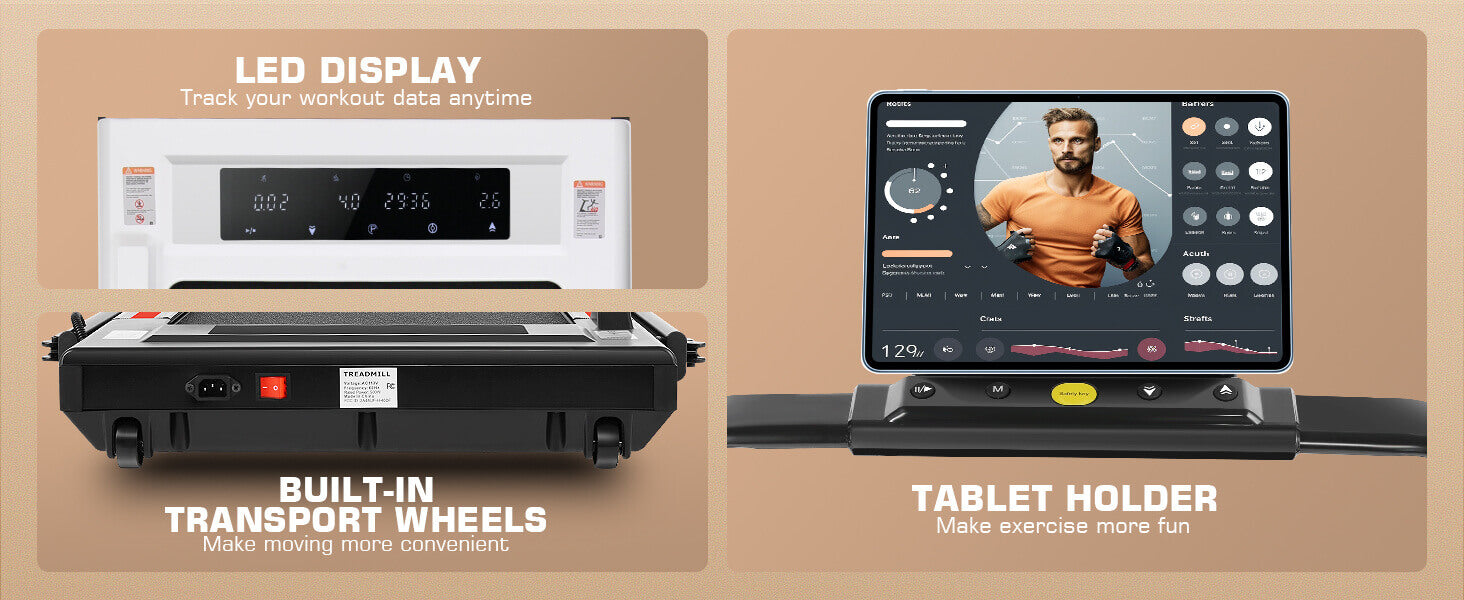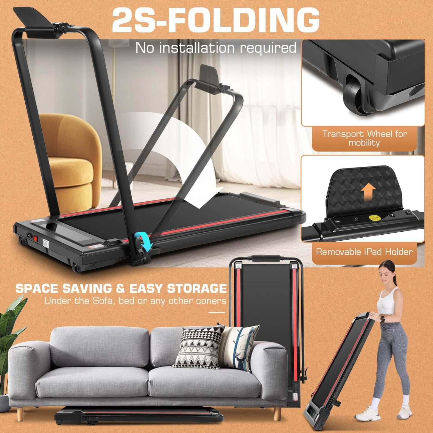 • 2s Folding Treadmills for Home: No assembly is required, the treadmill can be used directly after unboxing. The one-step folding system allows the treadmill to be folded in just 2s. This walking mat is only 4.5 inches thick, allowing you to hide it under your couch or bed. The front transport wheels make it easy to move anywhere, perfect for homes, apartments, and offices.