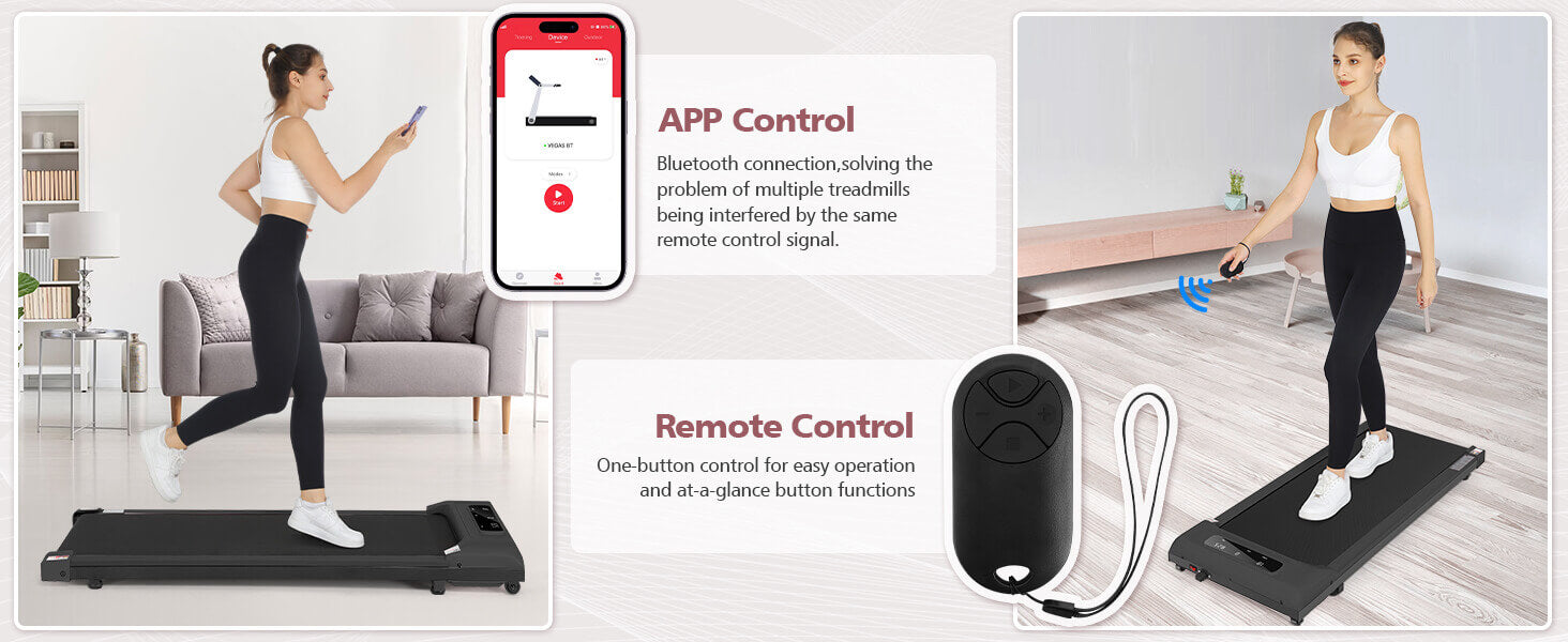 APP & Remote Dual-control: Our walking pad treadmill features a unique dual-control system for effortless switching between app and remote control. This innovative design eliminates interference with other machines, making it ideal for office settings or homes with multiple treadmills.